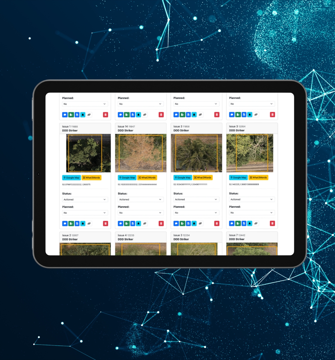 - Automated Reports of individual trees with meta enriched high-resolution imagery, and What3Words coordinates.